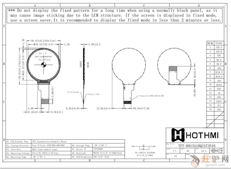 | 型号:TFT-H013A1HQIST3N16(1.3寸 圆形 TFT) |
